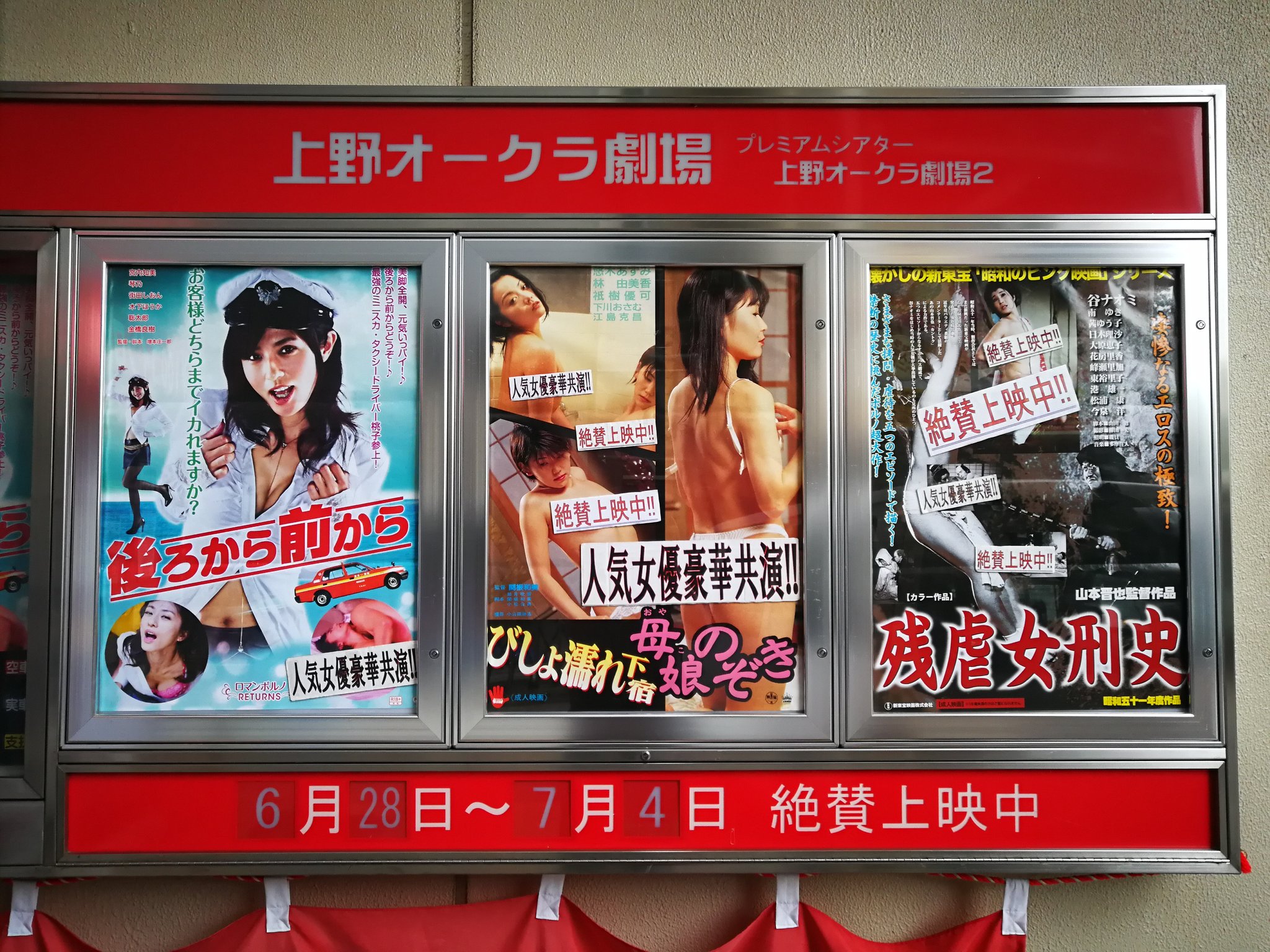 高橋典幸 On Twitter 久しぶりに上野の成人映画館の上野オークラ劇場に行きました 同時上映は昭和51年公開の山本晋也監督作品もあり 3本立て上映を楽しみました 成人映画も傑作 名作の物語が多いので好きです 後ろから前から 残虐女刑史 びしょ濡れ下宿母